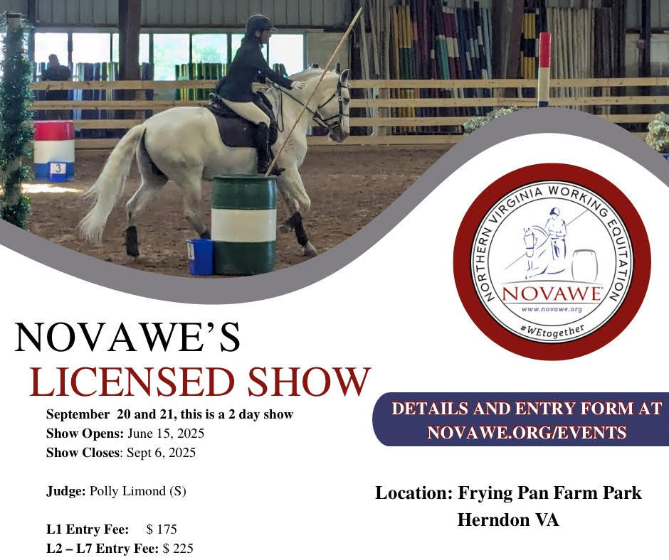 Mark your calendars! NOVAWE is hosting a licensed show on September 20–21 at Frying Pan Park in Herndon, Virginia. This two-day show is open to all levels and will be judged by Polly Limond (S). Whether you’re just getting started at L1 or riding at the upper levels, this is a great opportunity to challenge yourself and enjoy a fun, supportive competition environment. Entry fees are $175 for Level 1 and $225 for Level 2 and up. Entries close on September 6, so don’t delay—get your entries in and come ride with us!